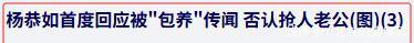 杨恭如为了恢复名誉,赶紧自曝自己的择偶三大标准,说“现代社会当然只能一夫一妻,现实生活中的我,对感情是非常专一的,至于对另一半的条件,我早说过,三大标准: 赏心悦目、志同道合、细致体贴 。” 说完,她上各种节目,坚决否认自己被包养,抢别人的老公。