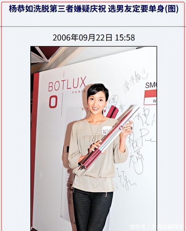 她在声明中表示,有一个杨姓女艺人横刀夺爱,插足她的豪门婚姻当中,导致她要和丈夫分居。 这则声明,令这个杨姓女艺人,成为了众矢之的。 几乎所有人都在猜,这个不要脸的小三是谁? 于是,广大网友列举出最可能当小三的女星,分别有杨采妮、杨恭如和杨千嬅。 其中杨恭如高票当选为“二奶”嫌疑人。