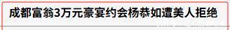 为了博得大众的同情,杨恭如还自曝,她经历过三段最受伤害的感情,都是发现对方有女朋友的,都是过了一段时间就发现对方有另一个人,无缘无故被挤到一个第三者的位置。 这段话,好似在说,她不是主动当小三的,都是被小三的,是别人的错。 可惜,没有人相信她。 经由周富豪这一事,“最美亚姐”杨恭如在富豪圈中也出了名,很多富豪以能泡到她为荣。 2003年,杨恭如到成都参加一个活动,一名已婚百万富翁得知她的行程后,当场在一个豪华餐厅花费三万元,包了一桌极品燕鲍席,希望能与杨恭如共进晚餐,发生了啥。 不料,遭到了杨恭如的拒绝。